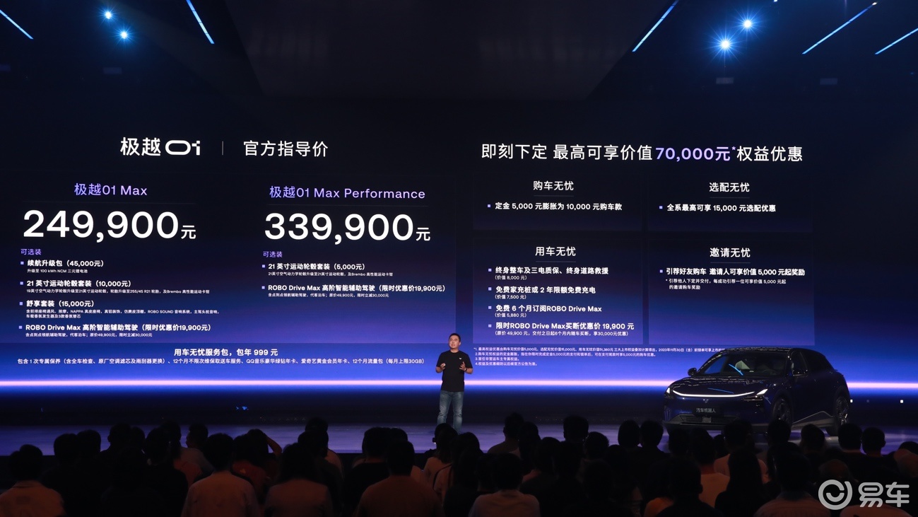 上市期间,用户下定最高可享价值70,000元综合权益优惠,其中包括5,000元定金可抵10,000元购车款、全系最高15,000元选配优惠、终身整车/三电质保、终身道路救援、免费家充桩或2年限额免费充电,以及高阶智驾ROBO Drive Max免费订阅6个月、限时终身买断立减30,000元等权益,此外邀请购车立享价值5,000元起奖励。