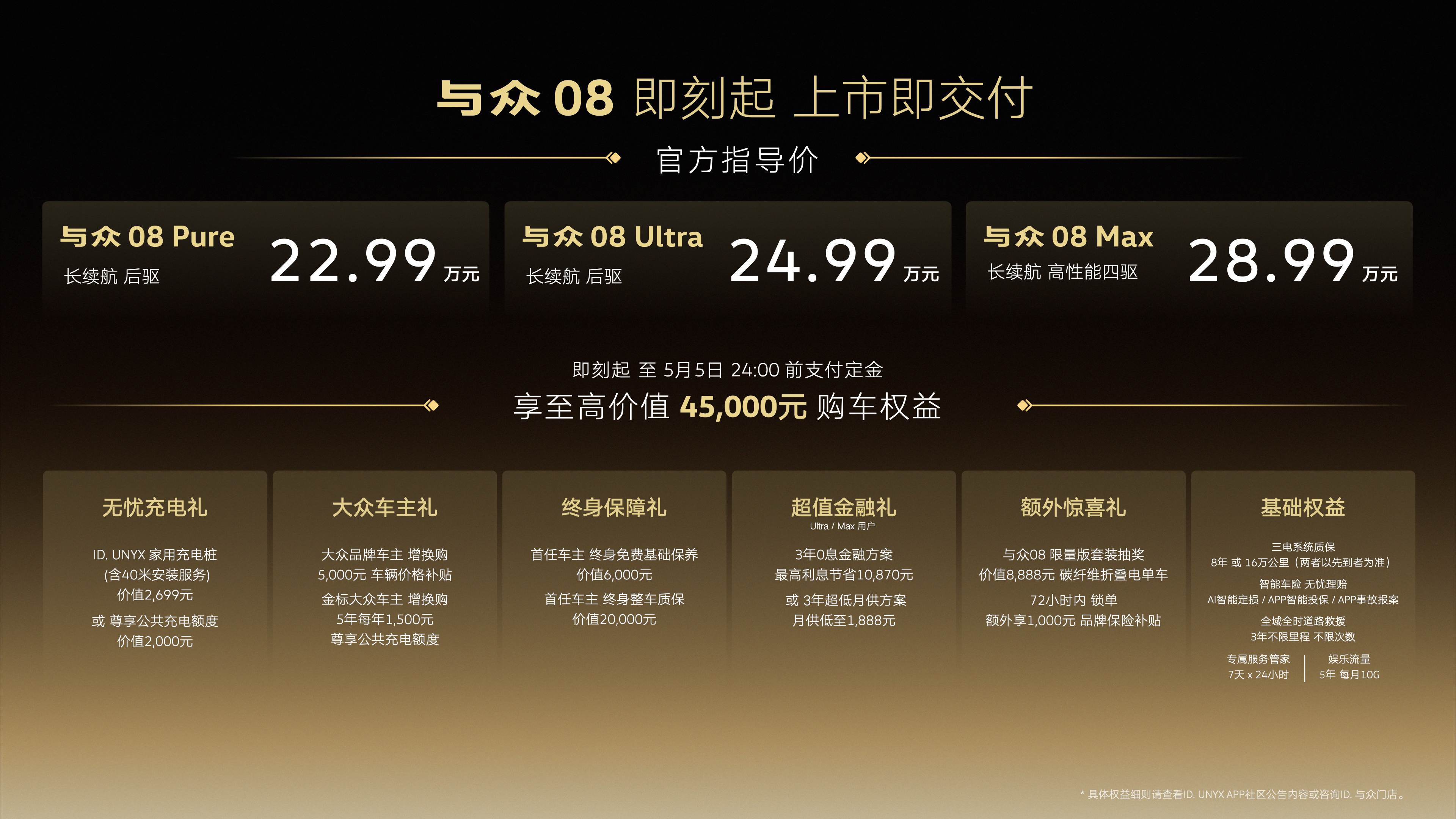 2026年4月16日,历经24个月的潜心开发,金标大众旗下首款全时互联全尺寸纯电SUV——与众08正式上市,新车推出了Pure、Ultra、Max共3个版本,官方指导价为22.99万元-28.99万元。新车推出了丰富的限时权益,即刻起至5月5日24:00前支付定金,即可享至高价值45,000元购车权益。